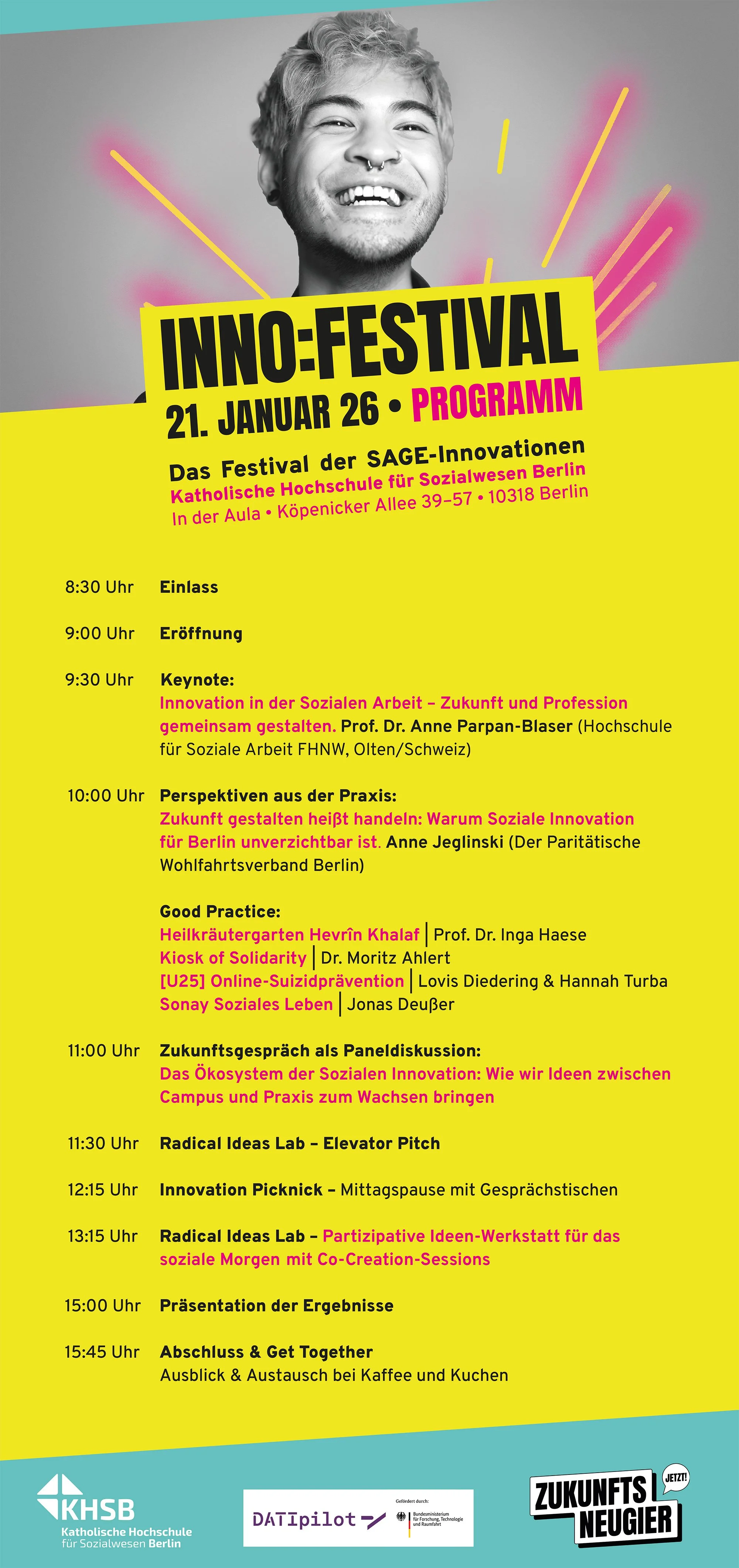 Freut euch auf inspirierende Keynotes, lebendige Zukunftsgespräche, das Radical Ideas Lab, den kuratierten Inno:Markt und einen Tag voller Austausch, Impulse und Vernetzung.